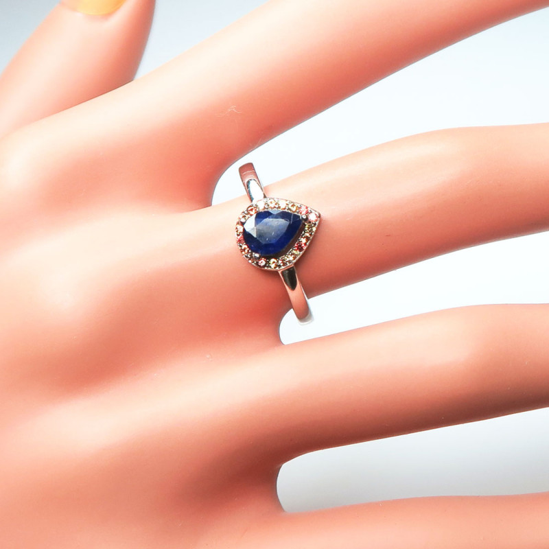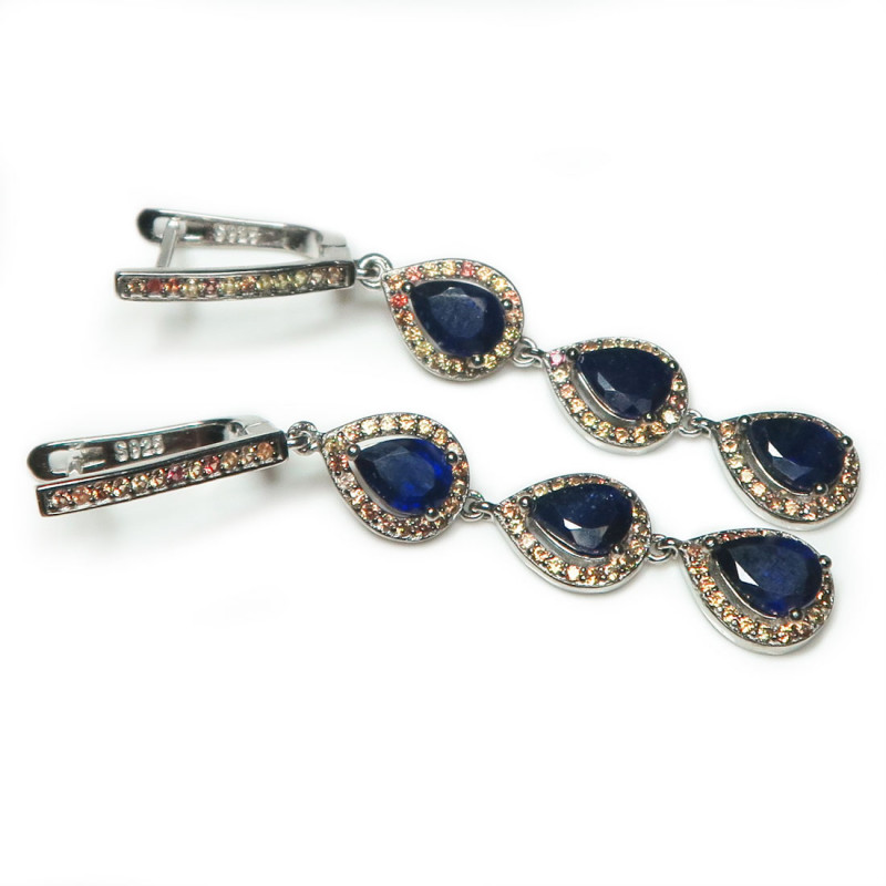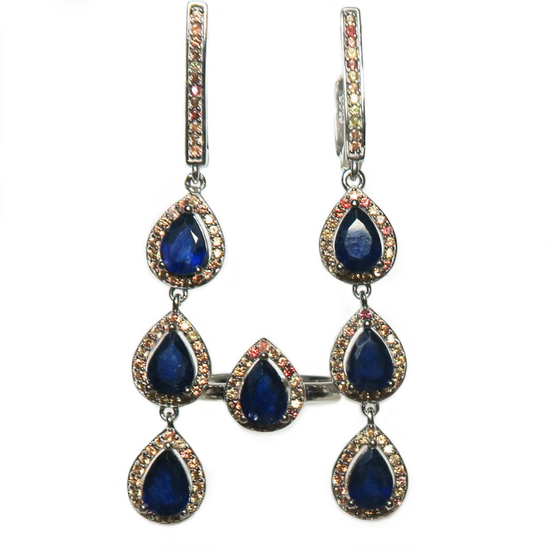 Комплект с синими сапфирами в обрамлении желтых сапфиров, размер кольца 17.5-17.75, размер изделия в кольце 10*9 мм., вес комплекта 9.13 гр. Размер синих сапфиров 5*7 мм. Камни с хорошей прозрачностью. Длина серьги 3.8 см., без учета замка. Металл серебро с родиевым покрытием, производство Таиланд.