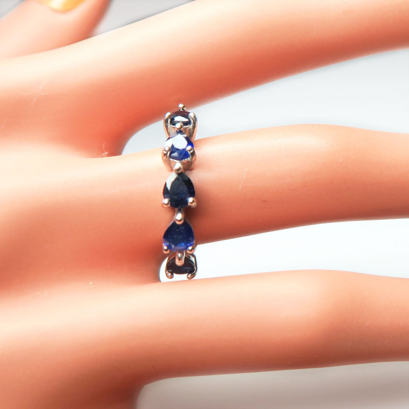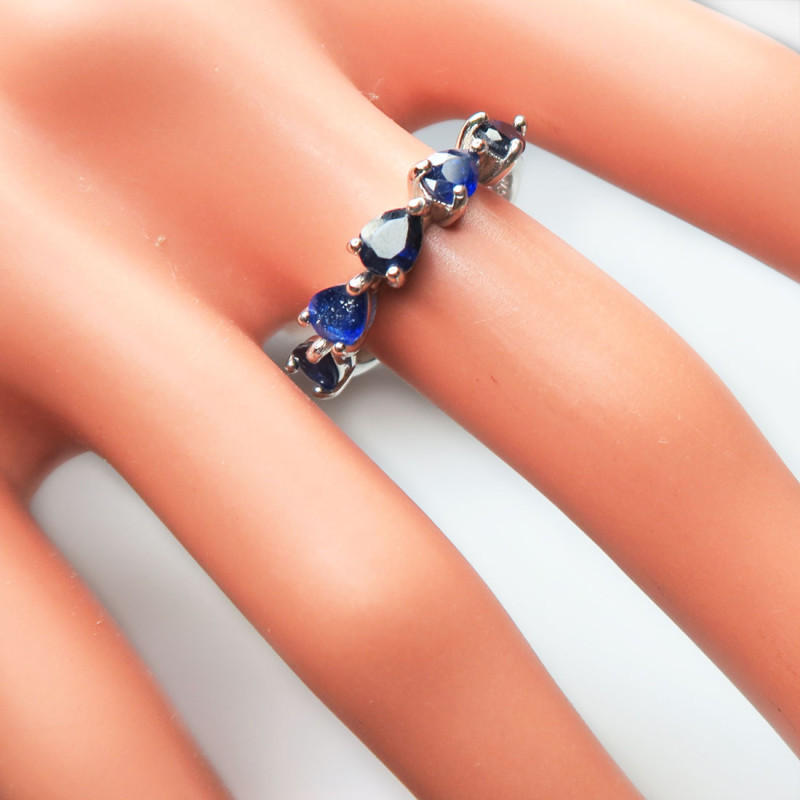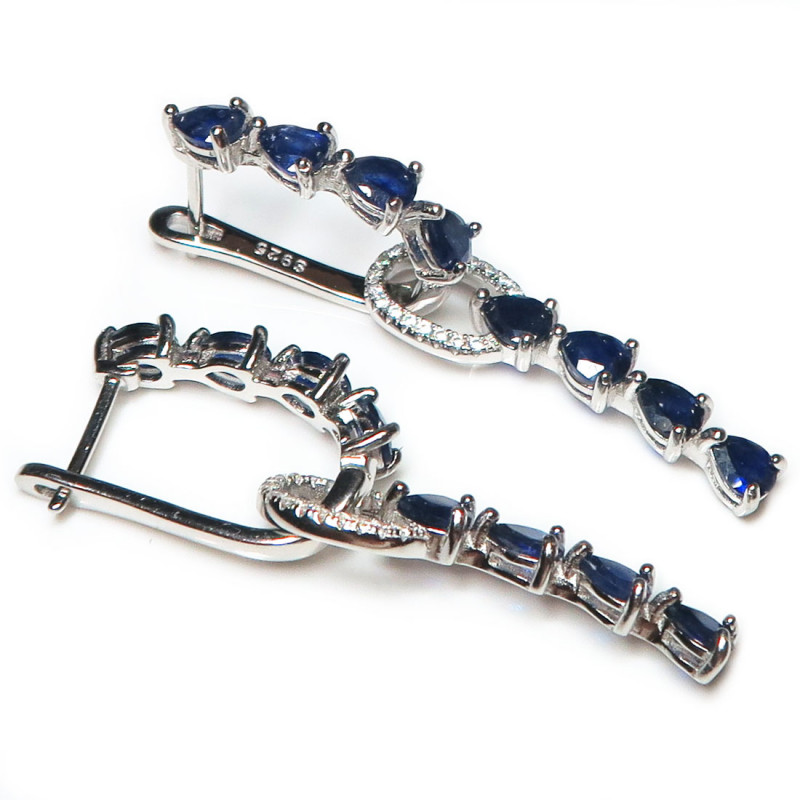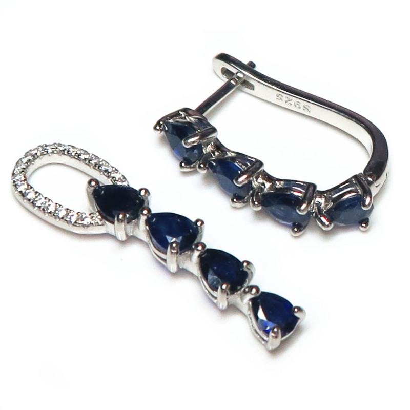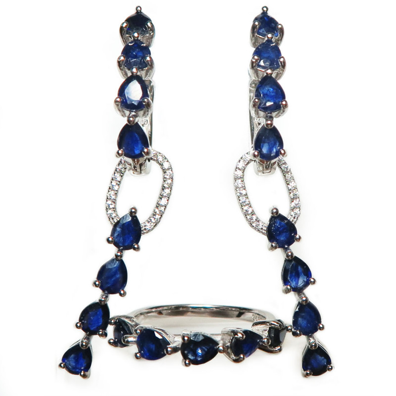 Комплект с сапфиром и мелкими фианитами, размер кольца 1775-18, вес комплекта 10.34 гр. Камни с огранкой, размер сапфиров 4*5 мм. Камни с хорошей прозрачностью. Длина серьги 5 см. с замком. Серьги можно одевать без нижней подвески, можно использовать подвеску как кулон. Металл серебро с родиевым покрытием, производство Таиланд.