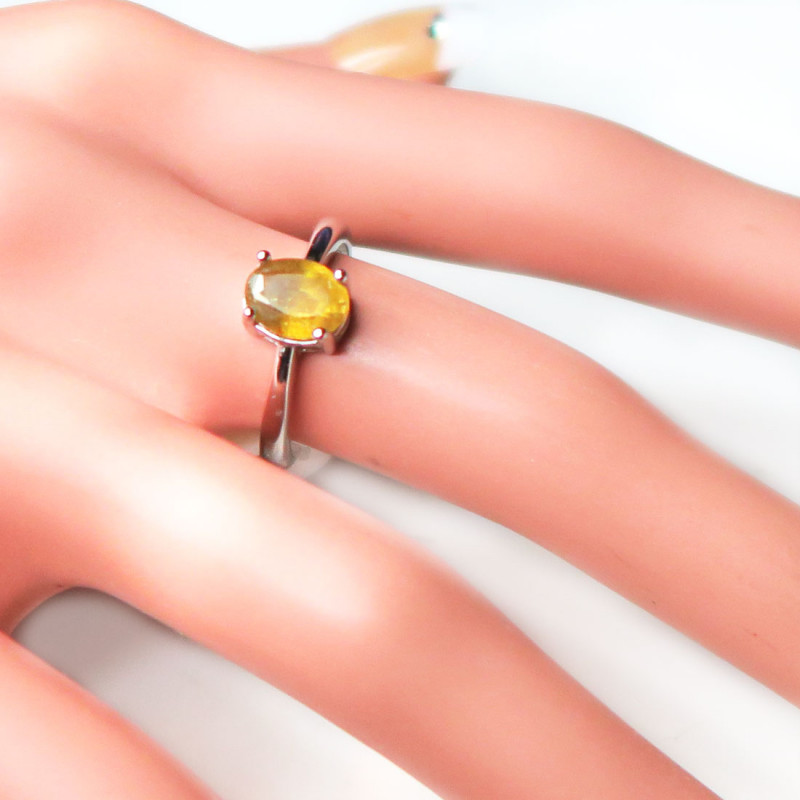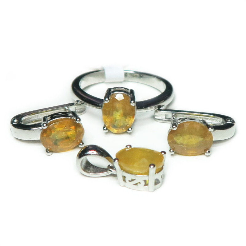 Комплект с желтым сапфиром, камни с огранкой. Размер кольца 16.5, размер камней в комплекте 6*8 мм. Металл - серебро радированное, вес комплекта 7.34 гр. Производство Таиланд.