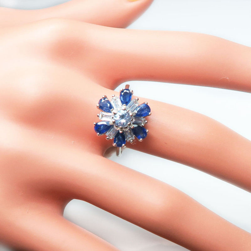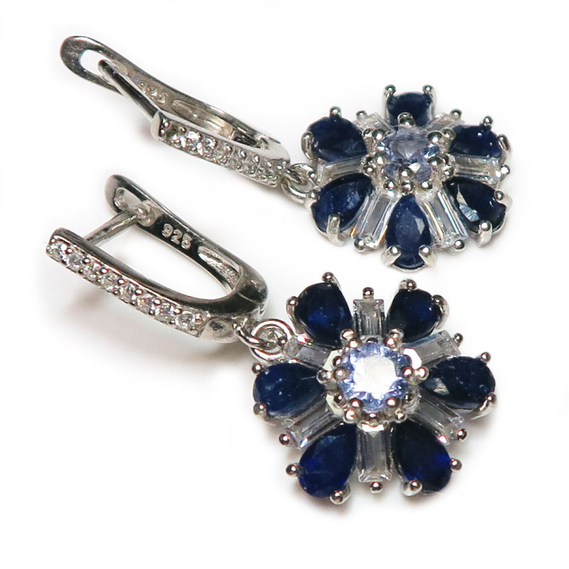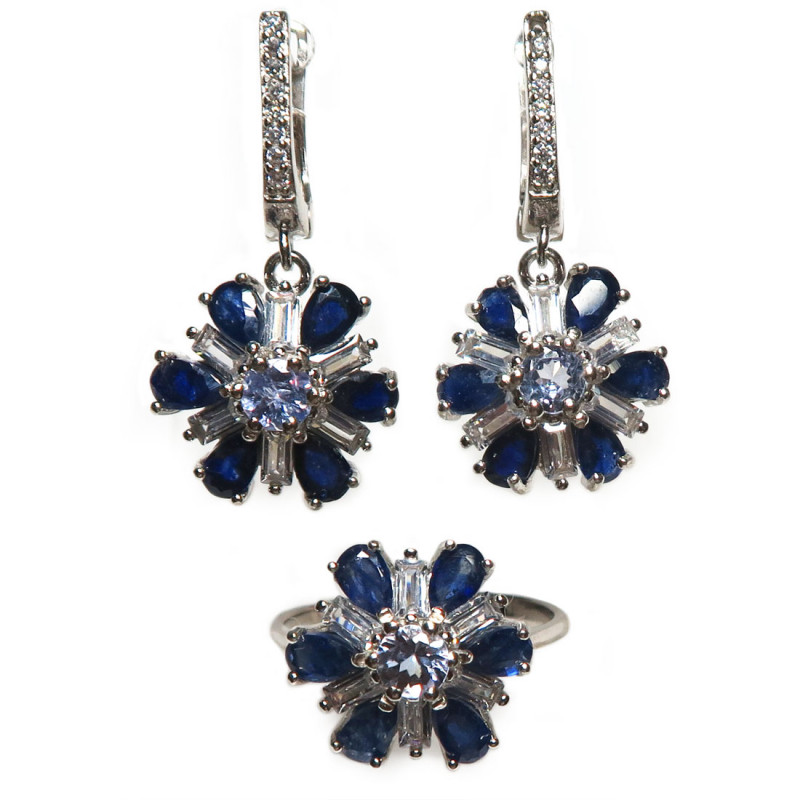 Комплект с сапфиром, танзанитом и фианитом, размер кольца 18, размер изделия 1.5 см., вес комплекта 8.65 гр. Размер сапфиров 5*3 мм. Камни с хорошей прозрачностью, металл серебро с родиевым покрытием, производство Таиланд.