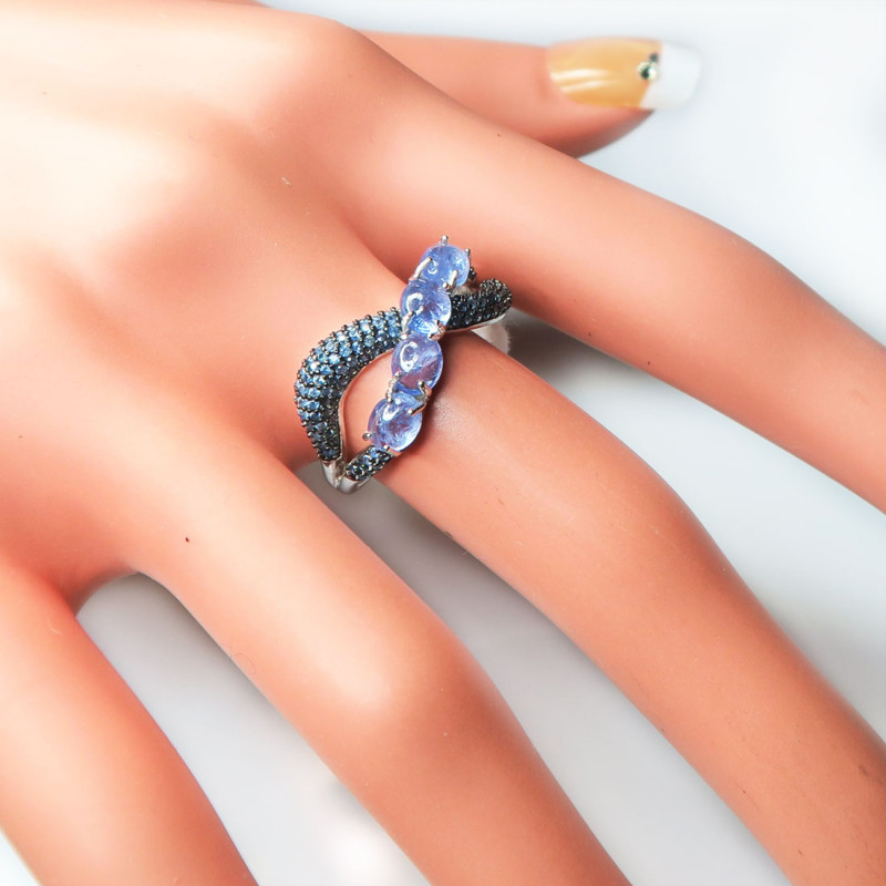 Комплект с танзанитом и сапфирами голубого цвета, размер кольца 19, размер изделия 2.5*1.2 см., вес комплекта 8.33 гр. Камни с огранкой, хорошего качества, в серьгах английский замок. Металл серебро с родиевым покрытием, производство Таиланд.