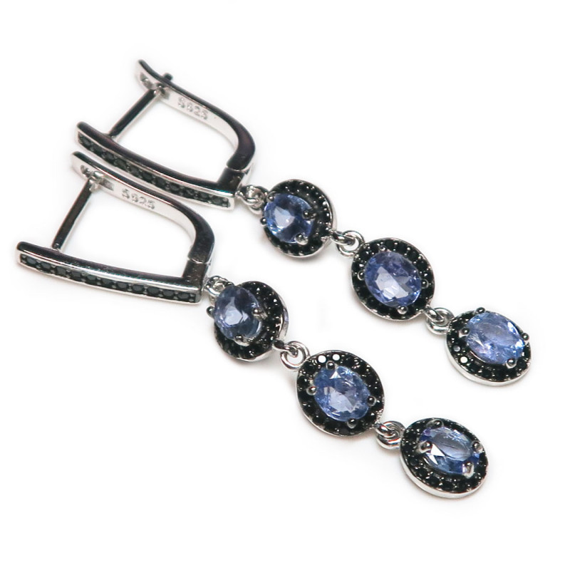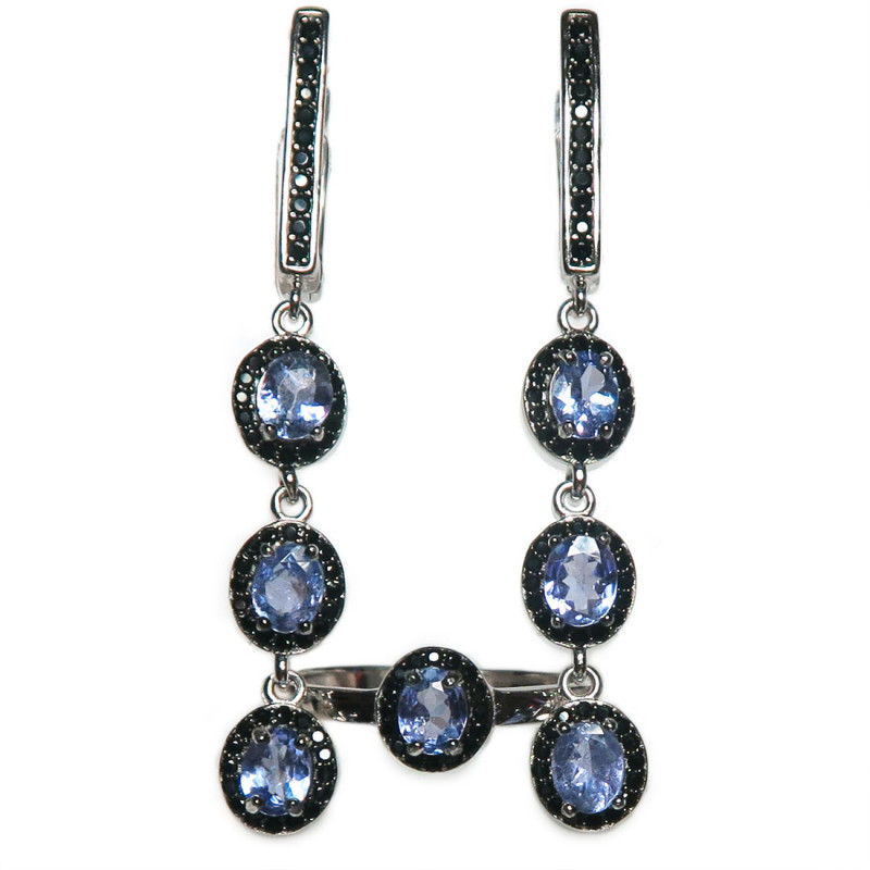 Комплект с танзанитом и сапфиром, размер кольца 17, 18.25, размер изделия в кольце 7*8 мм., вес комплекта 6.77 гр. Камни с огранкой, размер танзанитов 6*4.5 мм. Камни с хорошей прозрачностью. Длина серьги 3 см., без учета замка. Металл серебро с родиевым покрытием, производство Таиланд.