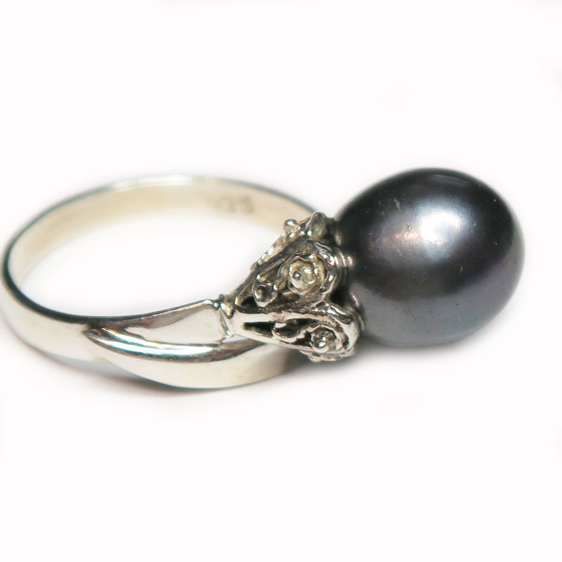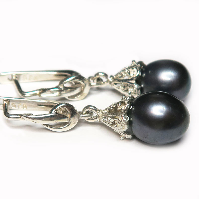 Комплект с черным жемчугом, размер кольца 18.5, 18.75, длина серьги 1.7 см. без учета замка, в серьгах английский замок, вес комплекта 10.3-10.65 гр., размер жемчужины 1.2*0.9 см., производство Индия.