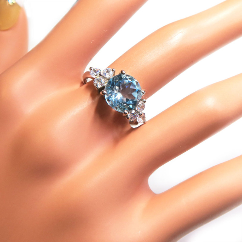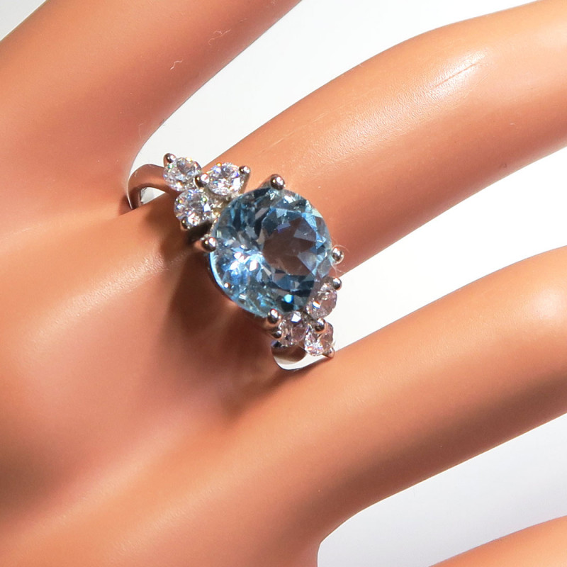 Комплект с голубыми топазами и фианитами: кольцо, кулон и серьги, размер кольца 18.5, размер камня в изделиях 1 см., хорошее качество камня, красивая огранка, металл серебро с родиевым покрытием. Вес комплекта 12.8 гр., производство Таиланд.