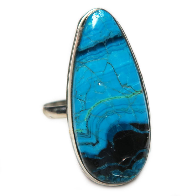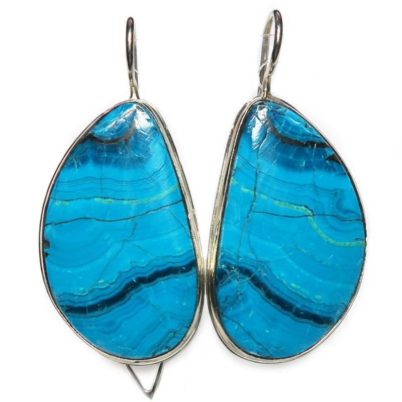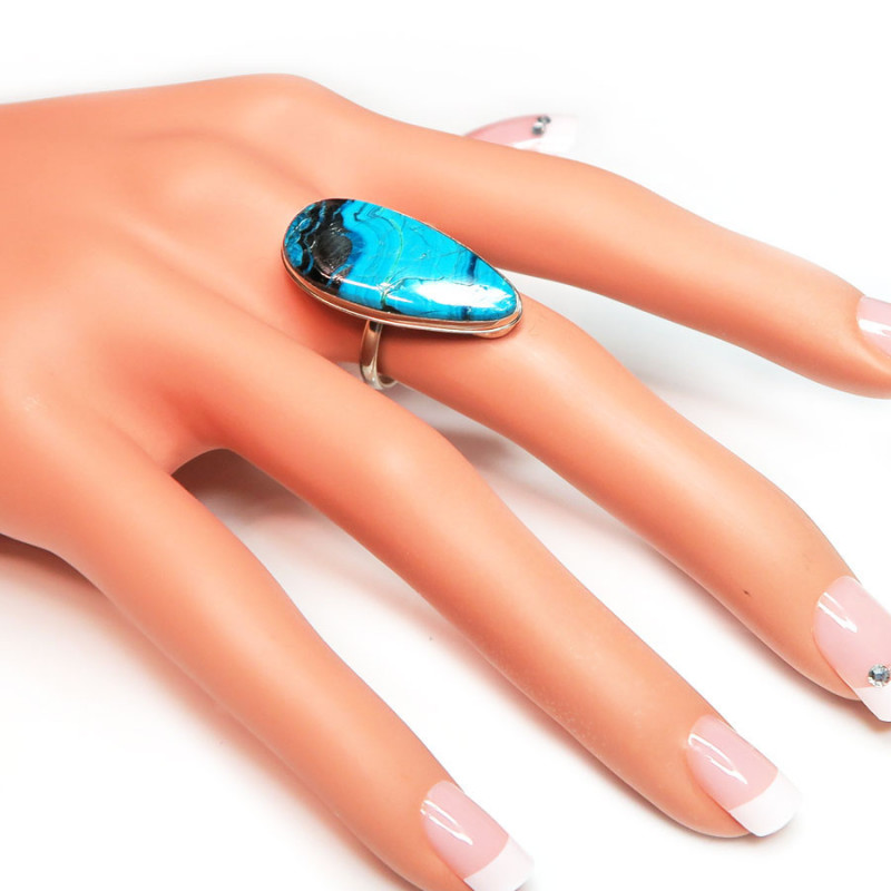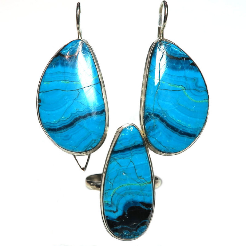 Комплект с натуральной хризоколлой красивого цвета, размер кольца 18, размер кольца можно немного отрегулировать в любую сторону, размер камня в кольце 1.2*3 см., размер камня в серьгах 1.6*2.7 см., металл нейзильбер, производство Россия.