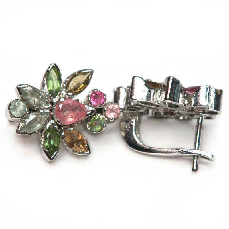 Комплект с турмалином разного цвета, размер кольца 18.25, размер изделия 2.2*2 см.. в серьгах английский замок, металл серебро с родиевым покрытием, вес комплекта 18.14 гр., производство Таиланд.