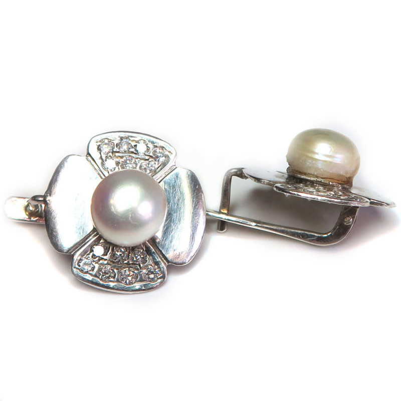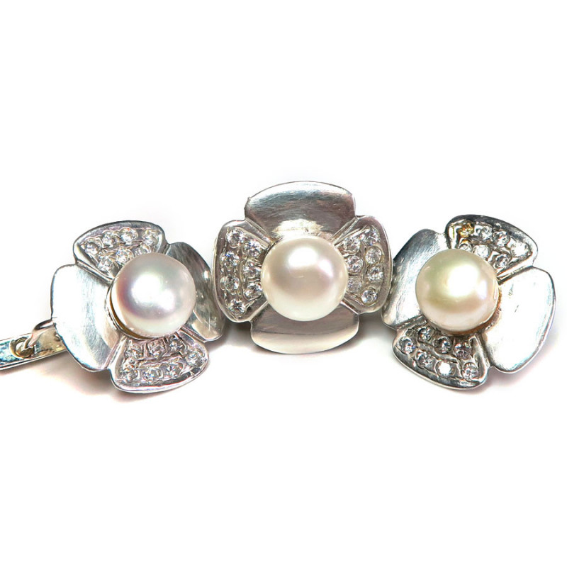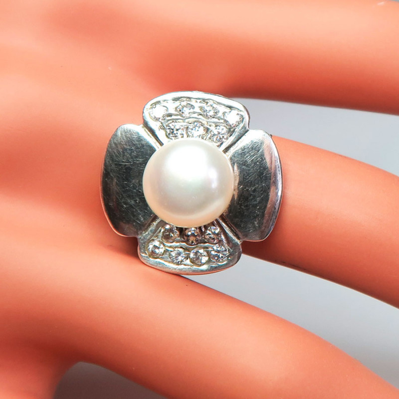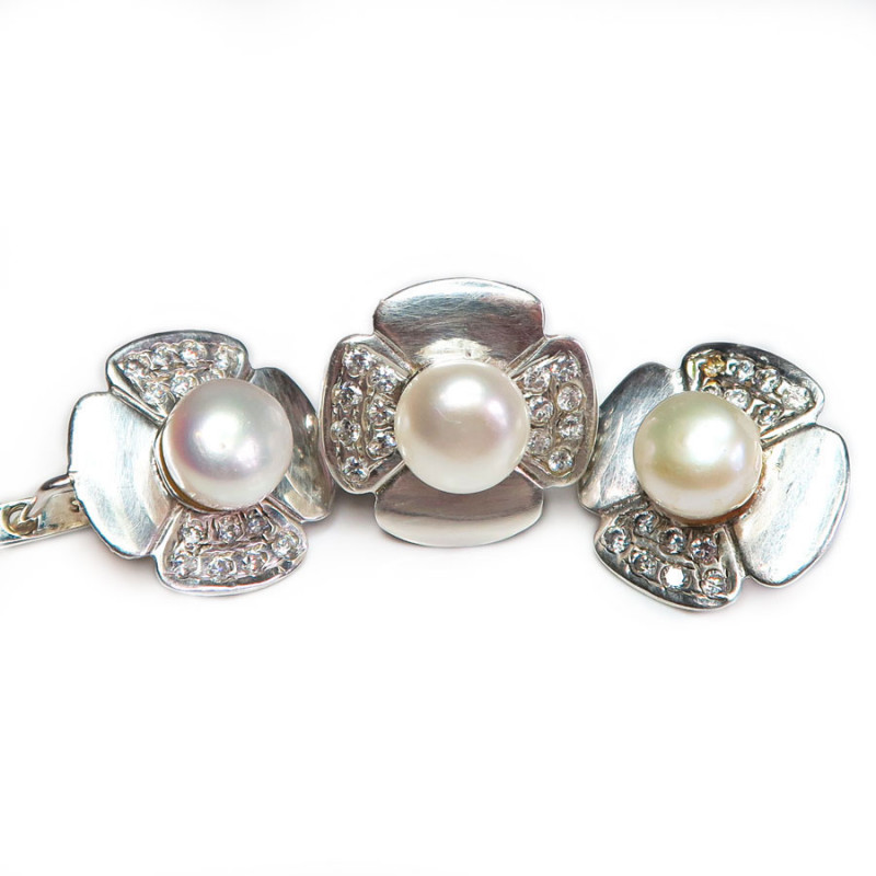 Комплект с натуральным жемчугом и фианитами, размер кольца 19.5, размер изделия 2*2 см., размер жемчужины 1.1 см., серебро, вес комплекта 13.84., производство Индия.