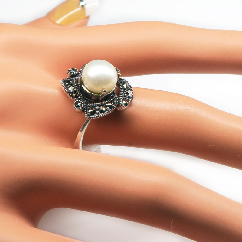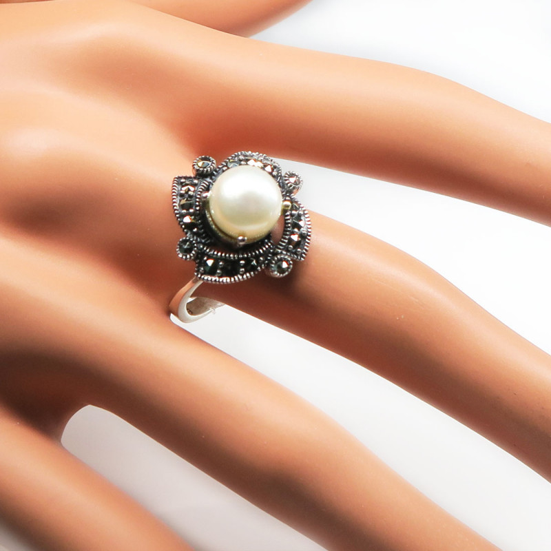 Комплект с натуральным жемчугом и марказитом, размер кольца 17.25, 18, размер жемчуга 0.9 см., размер изделия 1.7*1.7 см., в серьгах английский замок, металл серебро, вес комплекта 15 гр., производство Индия.