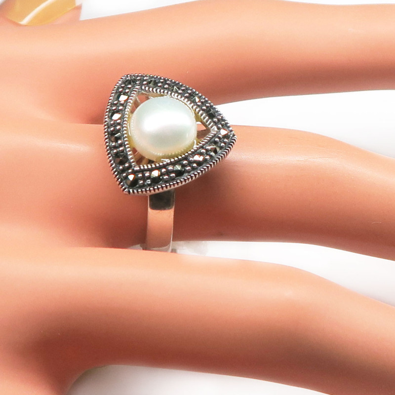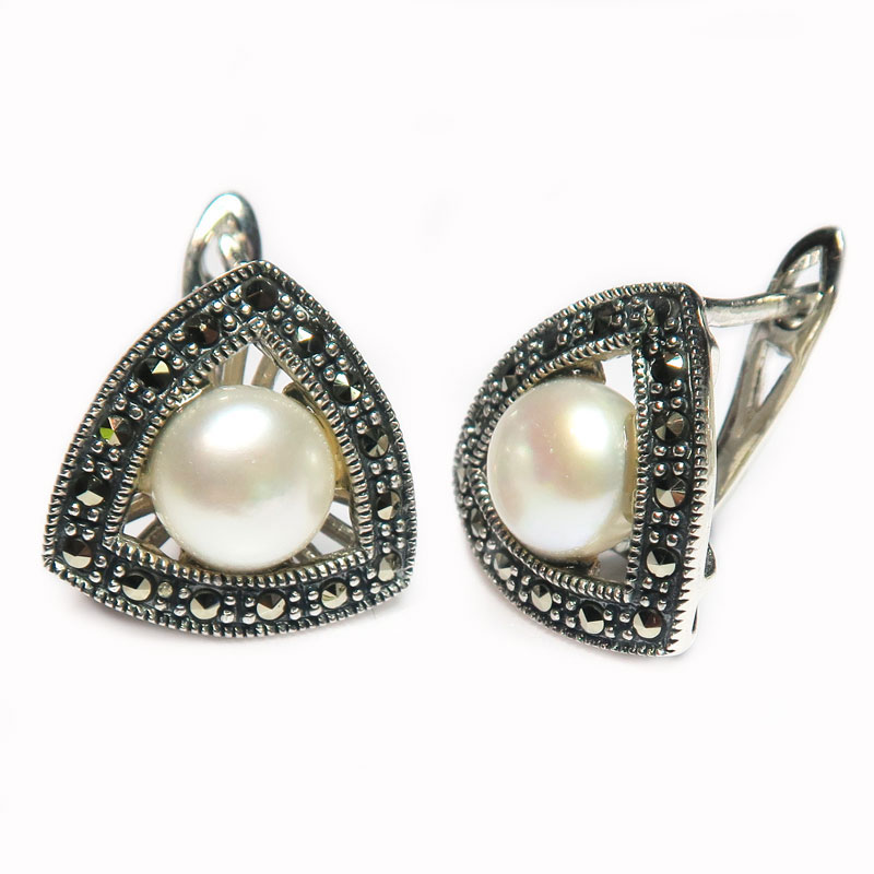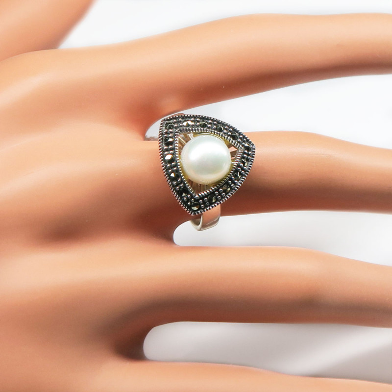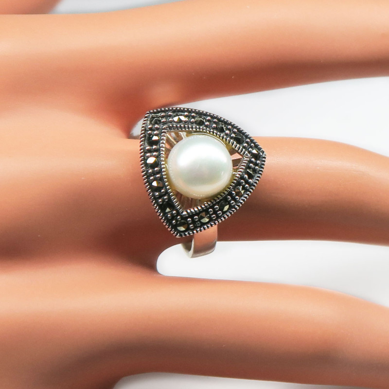 Комплект с натуральным жемчугом и марказитом, размер кольца 19, размер жемчуга 0.8 см., размер изделия 1.7*1.7 см., в серьгах английский замок, металл серебро, вес комплекта 13-13.46 гр., производство Индия.