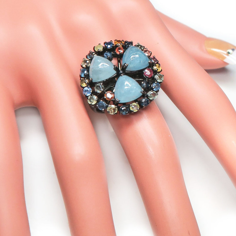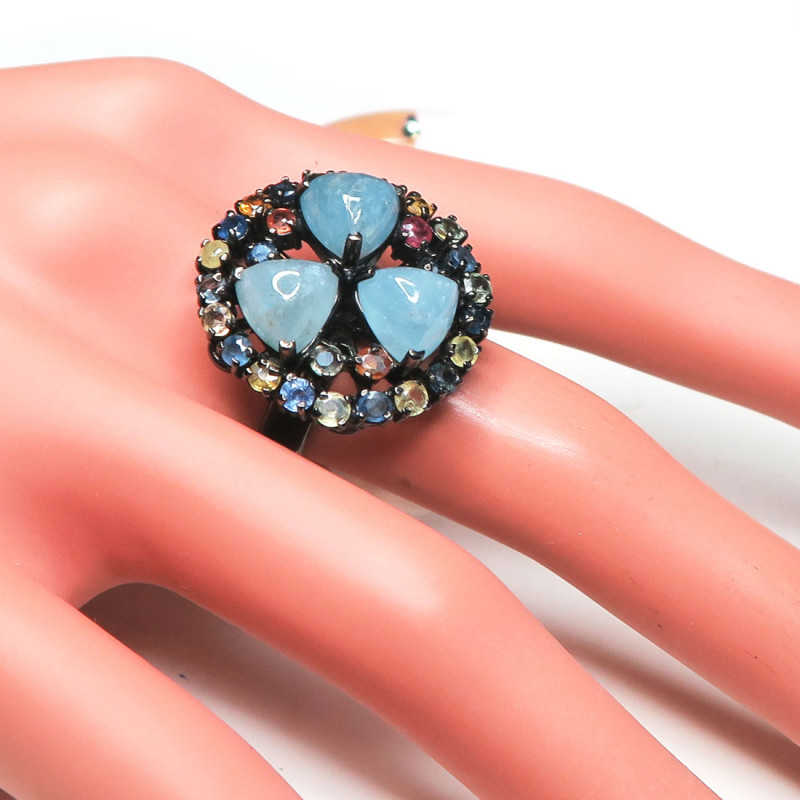 Комплект с аквамарином без огранки и цветными сапфирами с огранкой, размер кольца 18.5, размер изделия 2.5 см., в серьгах итальянский замок, вес комплекта 23.3 гр., металл серебро с покрытием черным родием, производство Тайланд.