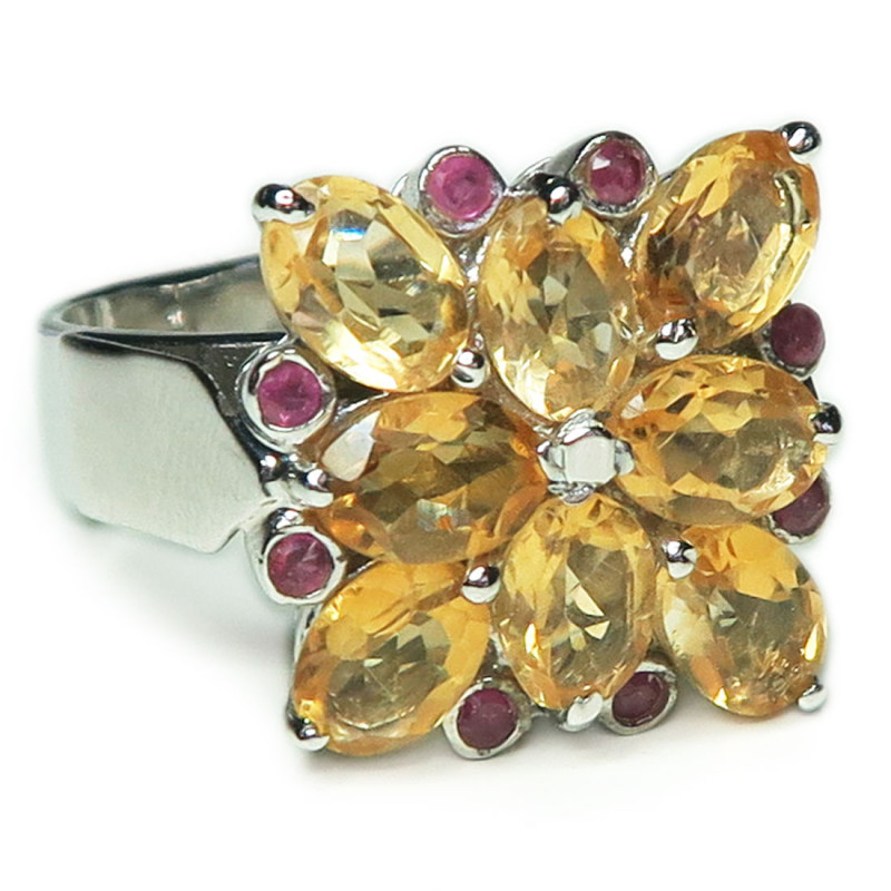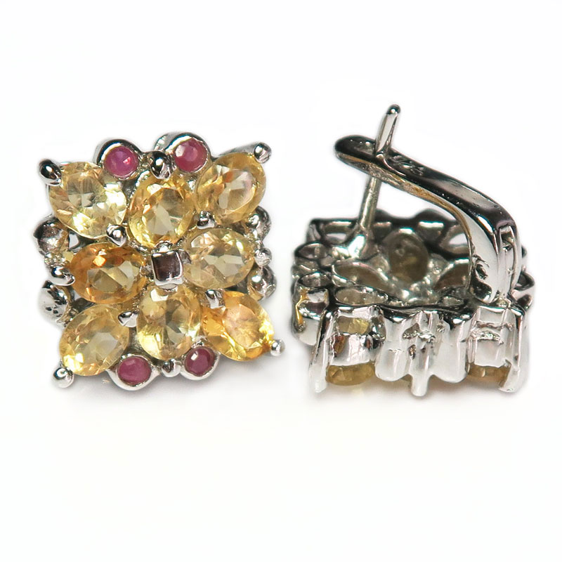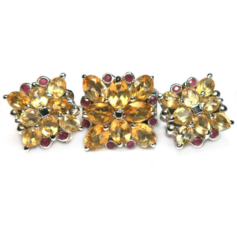 Комплект с цитрином и мелкими рубинами, форма сережек - ромб, размер изделия 2*2 см., размер кольца 18,5, размер изделия 1.7 см., серебро с покрытием родия, вес комплекта 24 гр., производство Таиланд.