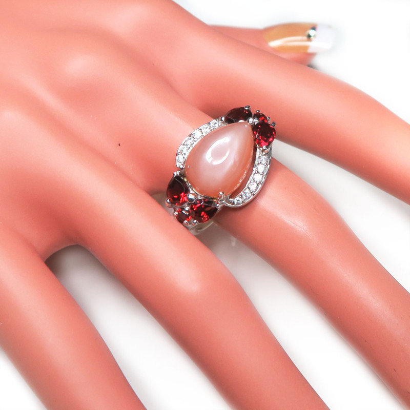 Комплект с натуральным олигоклазом (солнечный камень), гранатами и фианитами, размер кольца 19, камень кабошон, размер камня 1*1.5 см., размер изделия в серьгах 1.5*2 см., без учета замка, вес комплекта 14 гр., серебро с родиевым покрытием, высокое качество камней и самих изделий. Олигоклаз - редкая разновидность полевого шпата.