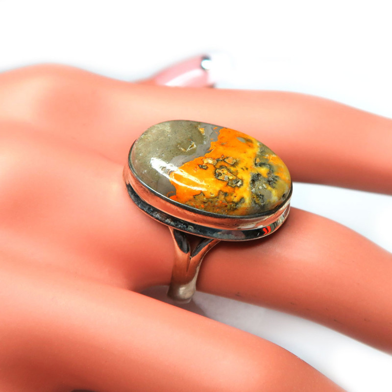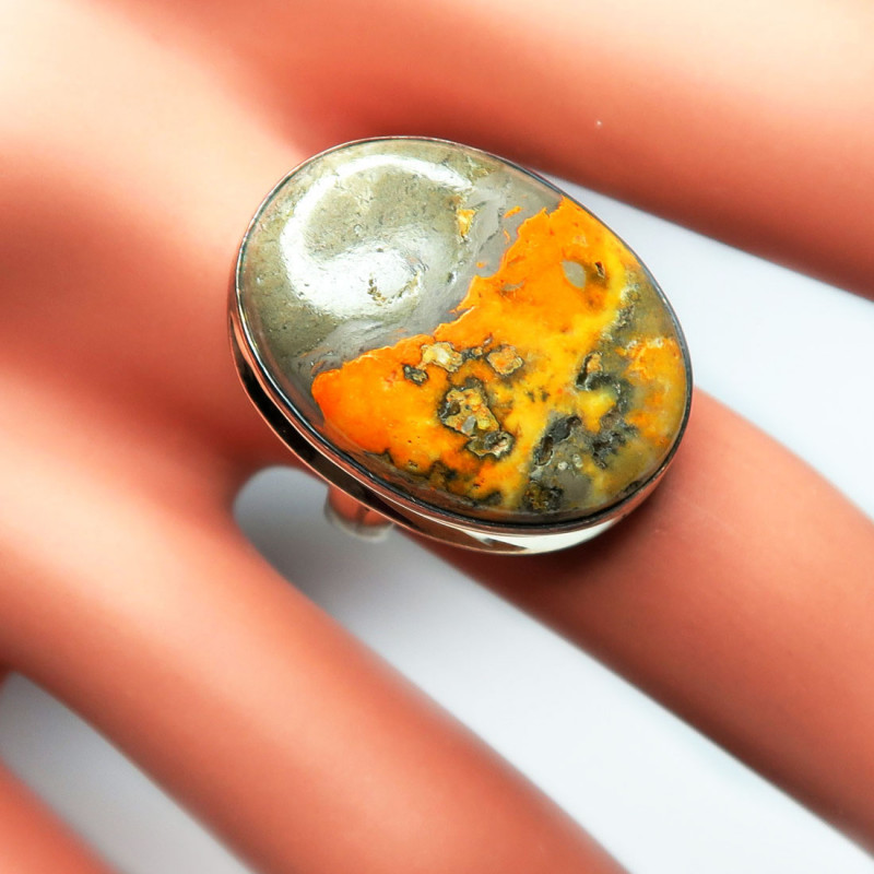 Комплект с яшмой желто-оранжевого цвета (шмелиная яшма), размер кольца 18, размер камня в изделиях 2.3*1.6 см., металл серебро с покрытием черным родием, вес комплекта 17.97 гр., производство Индия.