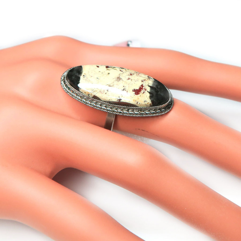 Комплект из уральской яшмы, размер кольца 19.5, размер камня в кольце 1.5*3.3 см., размер камня в серьгах 3.6*1.5 см., замок петля, металл нейзильбер, производство Россия.