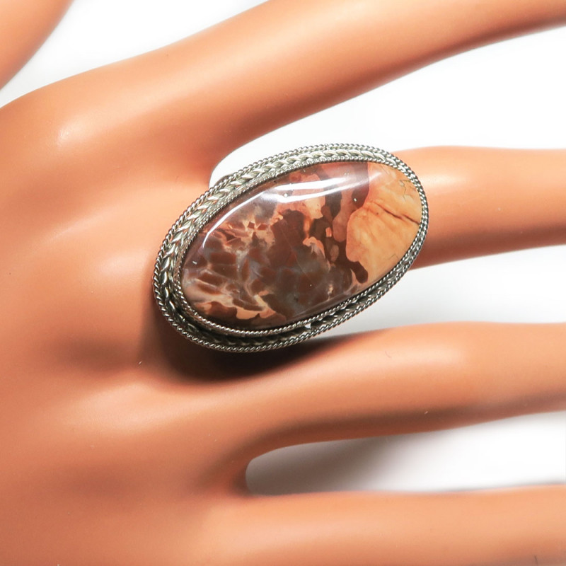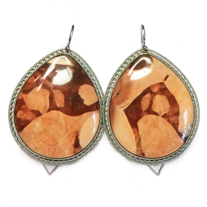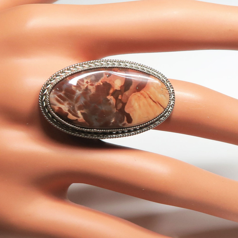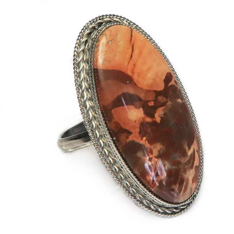 Комплект из уральской яшмы, размер кольца 18.75, размер камня в кольце 1.7*3.3 см., размер камня в серьгах 3.5*2.7 см., замок петля с защелкой, металл нейзильбер, производство Россия.