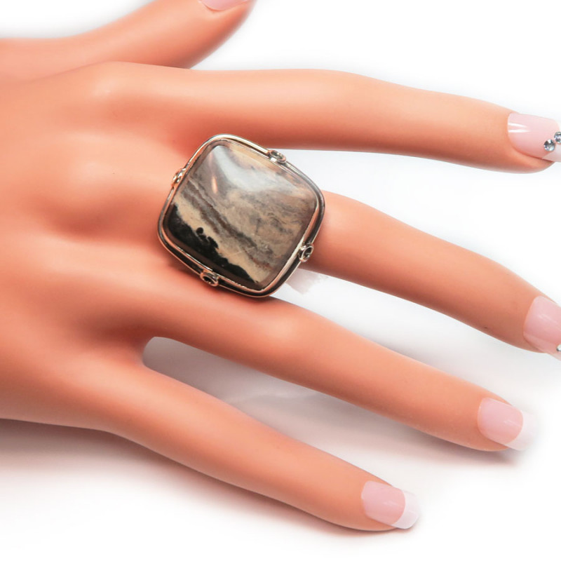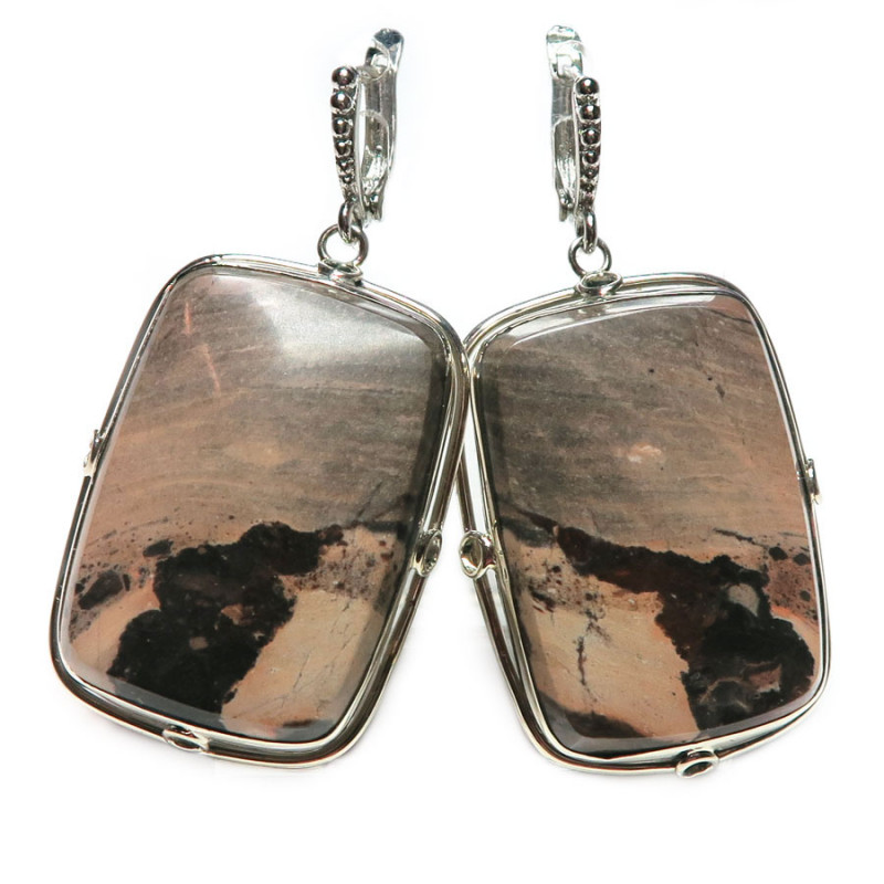 Комплект из уральской яшмы бежево-коричневого цвета, размер кольца 18.5, размер камня в кольце 2*2.2 см., размер камня в серьгах 2.3*3.3 см., замок английский, металл нейзильбер, производство Россия.