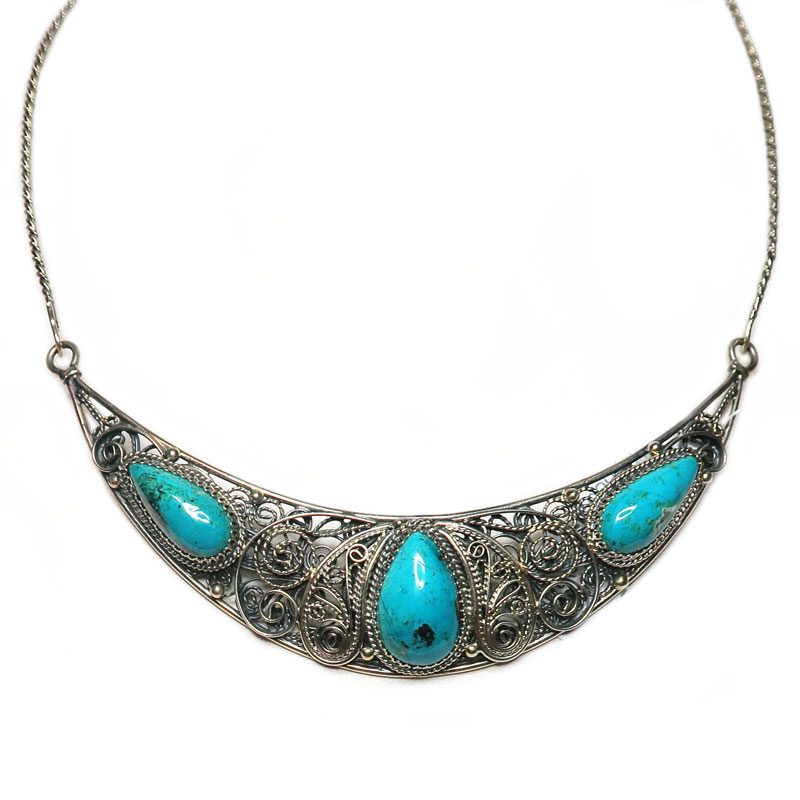 Колье с хризоколлой, ширина колье в центральной части 2.5 см., размер центрального камня 1.2*2.2 см., длина 47 см., размер центральной части 12*2.5 см., металл нейзильбер, производство Екатеринбург.