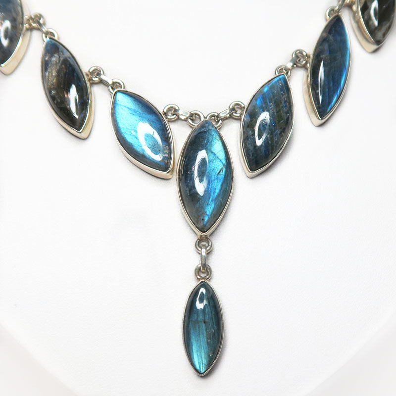 Колье с лабрадором высокого качества, без огранки, средний размер камня 2.5*1.2 см., длина колье регулируется цепочкой, максимальная длина 45 см., вес колье 56 гр., металл серебро, производство Индия.