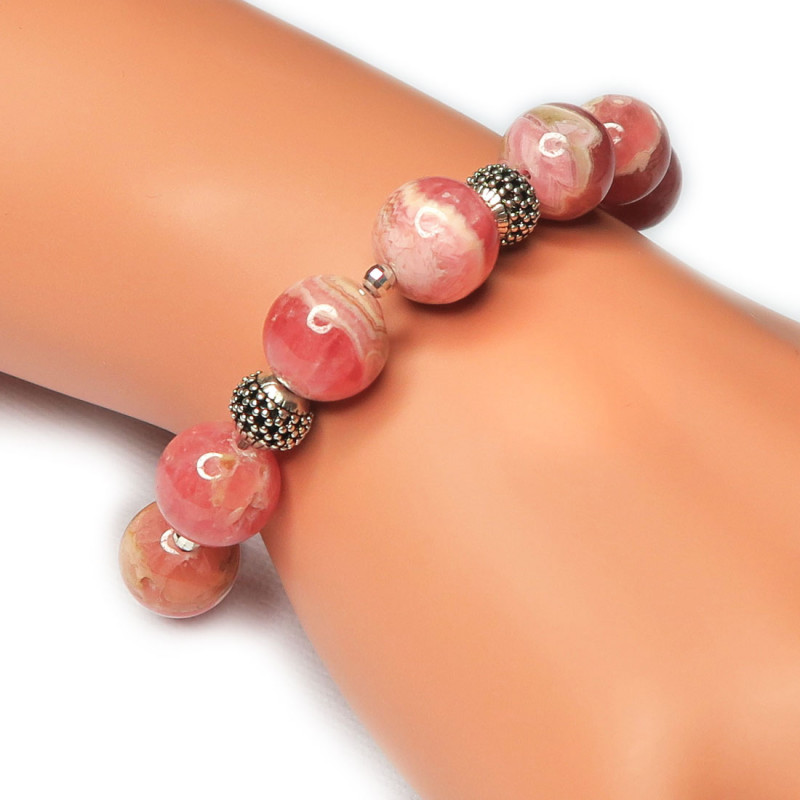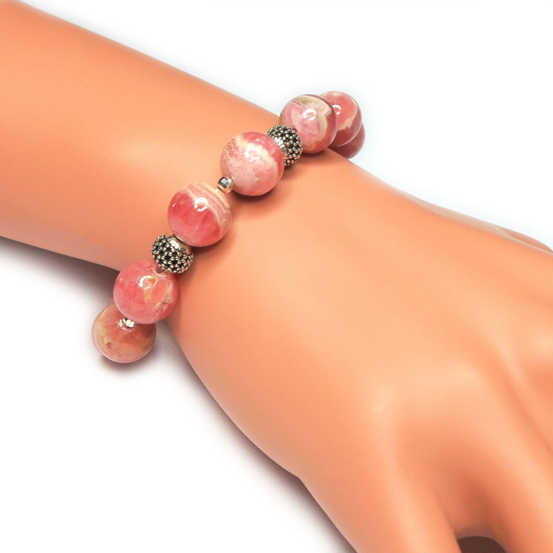 Браслет с родохрозитом, форма шарик, без огранки, размер камня 1.2 см., 0.6 см. Вес браслета 27.1 гр., длина 20.5 см., хорошее качество камня. Замочек карабин и граненые бусинки серебряные. Приобрести в интернет-магазине.
