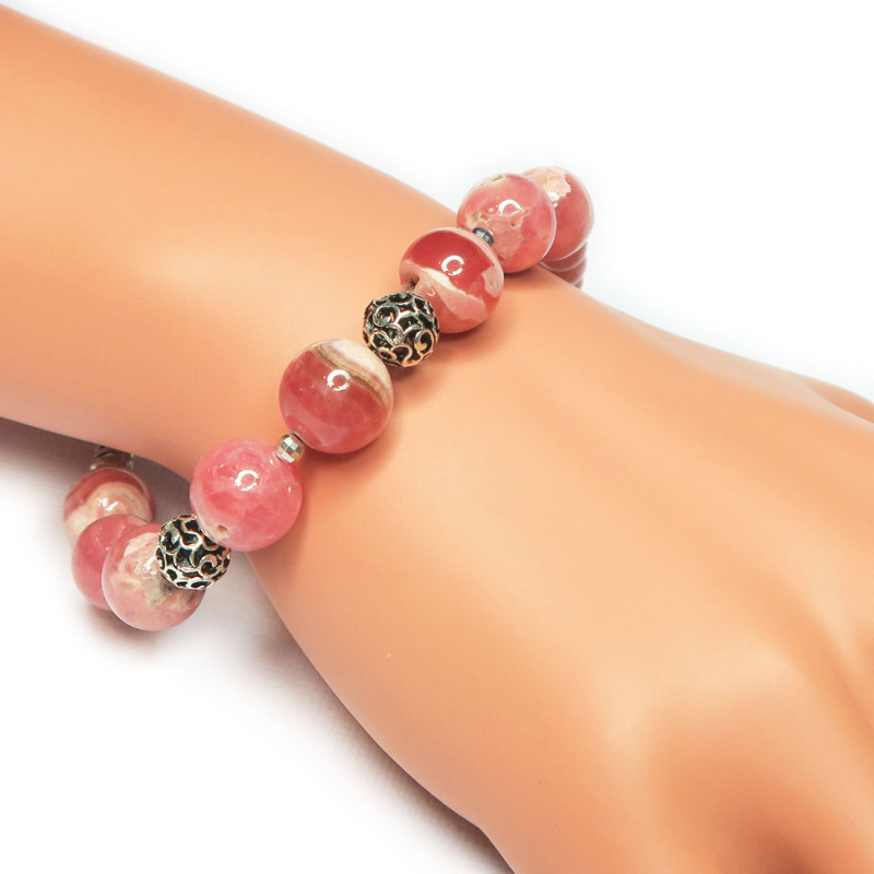 Браслет с родохрозитом, форма шарик, без огранки, размер камня 1.2 см., 0.6 см. Вес браслета 27.67 гр., длина 21.5 см., хорошее качество камня. Замочек карабин, все крупные и мелкие граненые бусинки - серебро. Приобрести в интернет-магазине.
