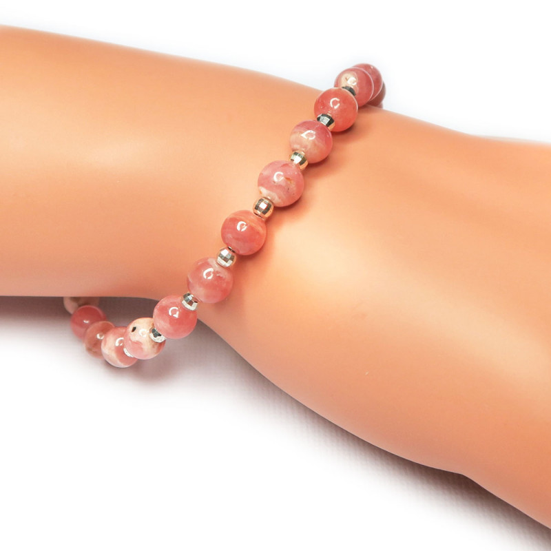 Браслет с родохрозитом, форма шарик, без огранки, размер камня 0.6 см. Вес браслета 14 гр., длина 21.5 см., хорошее качество камня. Замочек в виде цветка и граненые бусинки серебряные.