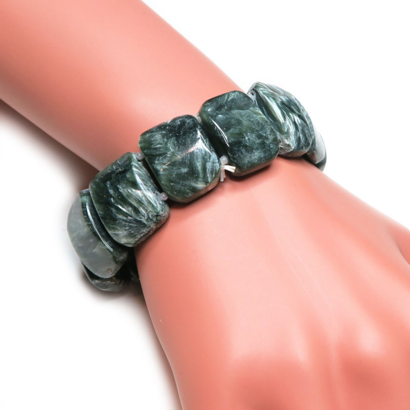Браслет из серафинита (клинохлор) на резинке. Размер грани 2.3*1.5 см. Камень без огранки, вес браслета 59.3 гр.