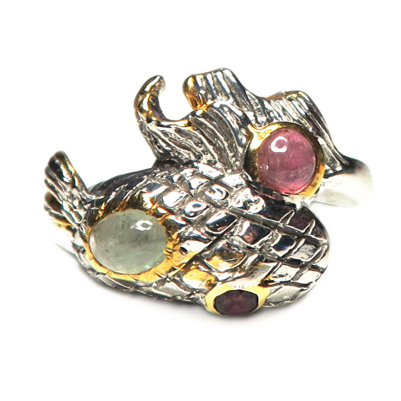 Кольцо с турмалином Рыбка, размер кольца 18, размер изделия 2.5*1.7 см., вес кольца 5.84 гр., металл - серебро с покрытием родием и позолотой, авторская работа, производство Таиланд.