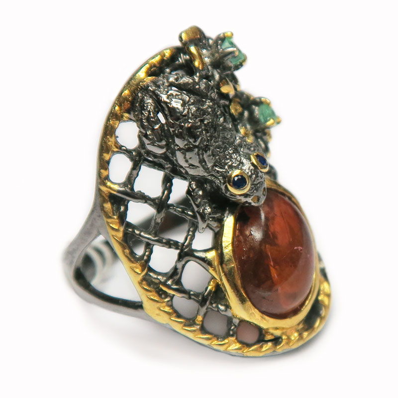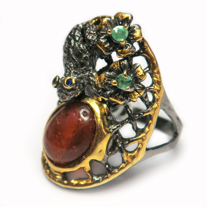 Кольцо с турмалином розового цвета без огранки и мелким изумрудом с огранкой, размер изделия 1.8*2.7 см., размер кольца 17, серебро с позолотой, вес кольца 7.1 гр., авторская работа, производство Тайланд.