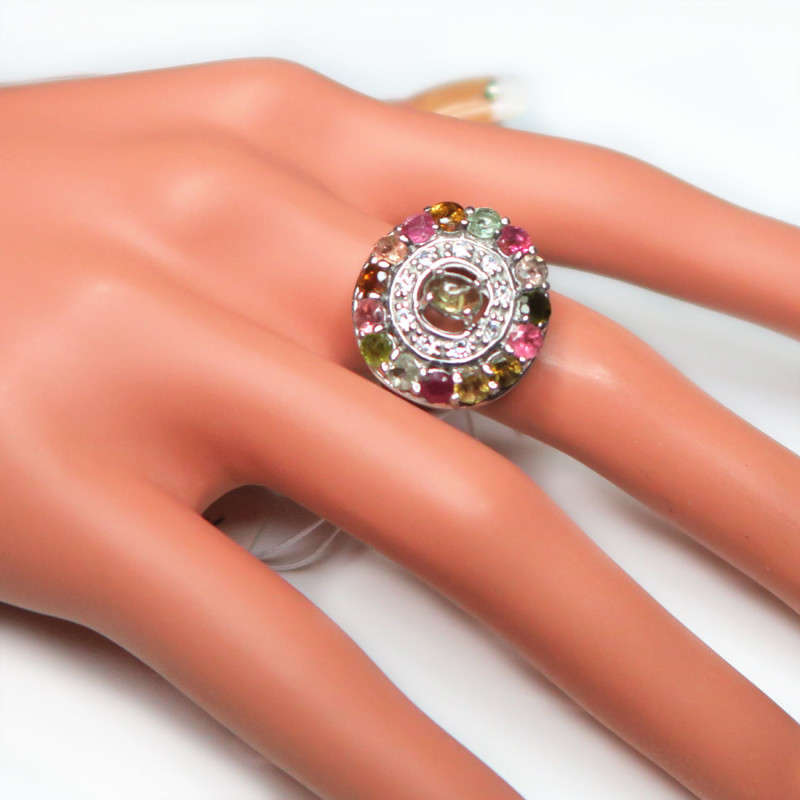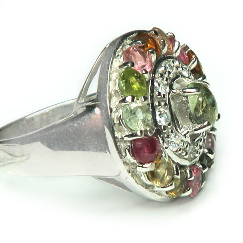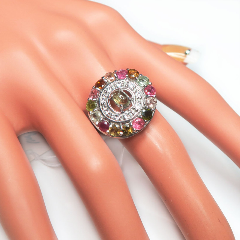 Кольцо с турмалином без огранки разного цвета и мелкими фианитами, размер кольца 19, размер изделия 2 см., металл серебро с родиевым покрытием, вес кольца 8.1 гр., производство Таиланд.