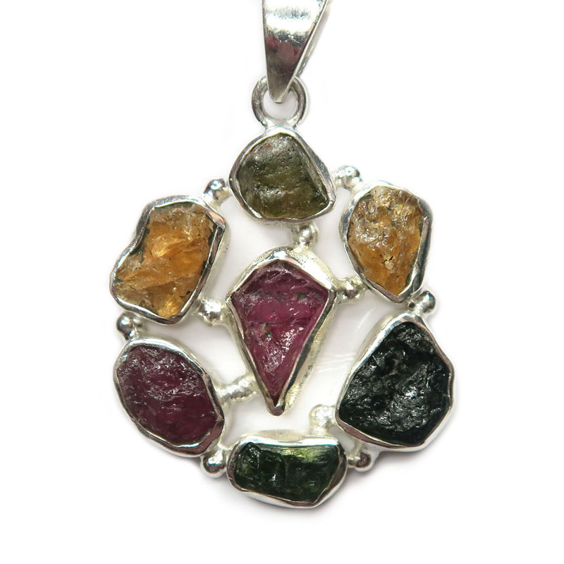 Кулон с кристаллами турмалина разного цвета, размер кулона 2.7*3 см., без учета держателя кулона, металл серебро, вес кулона 8.87 гр., производство Индия.