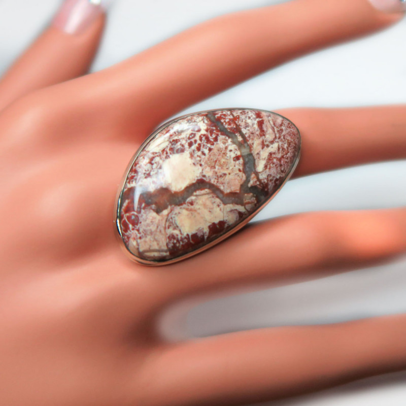 Кольцо с бежево-коричневой уральской яшмой, размер кольца 20, размер камня в кольце 1.9*3 см., металл нейзильбер, производство Россия.