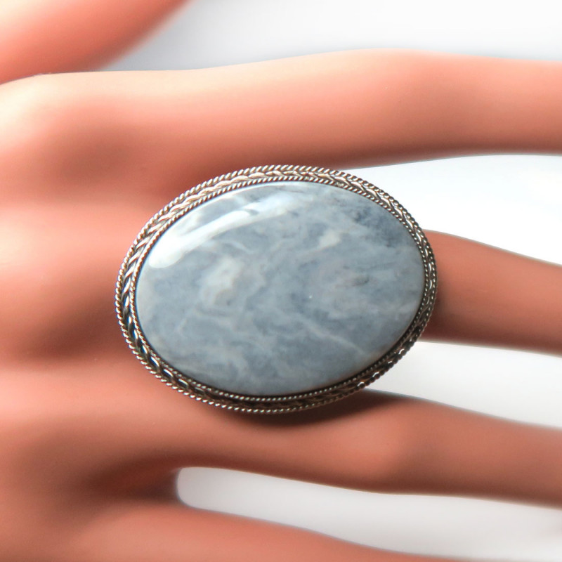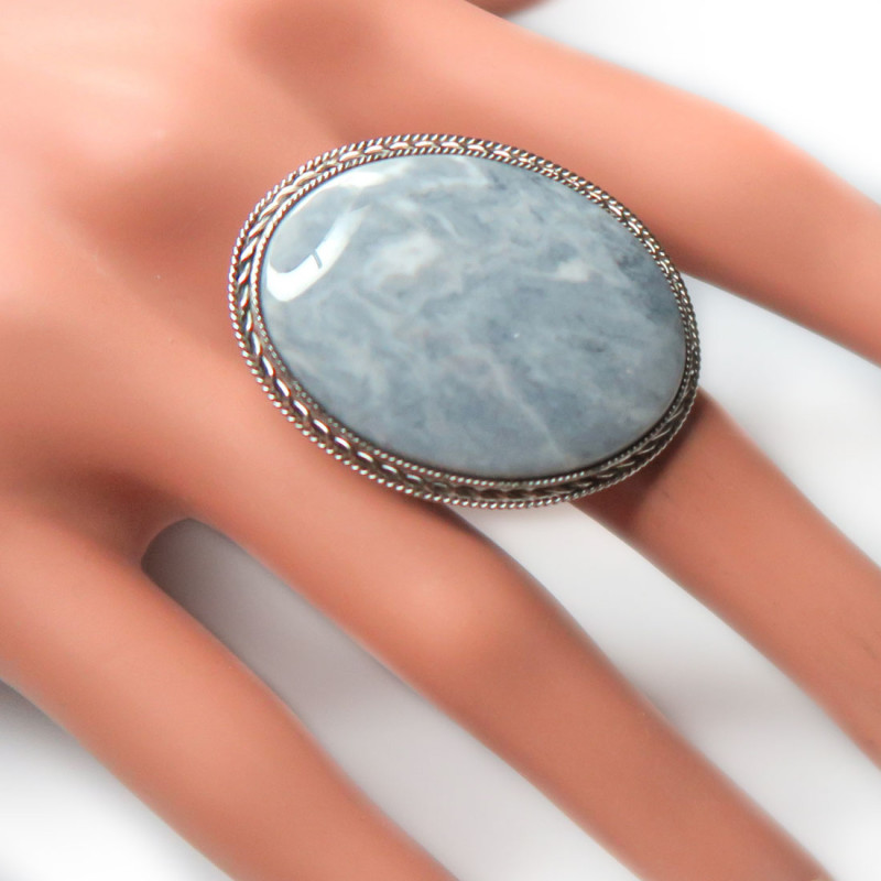 Кольцо с серой яшмой, размер кольца 20.5, размер камня в кольце 3.5*2.5 см., металл нейзильбер, производство Россия, размер кольца можно отрегулировать в любую сторону.
