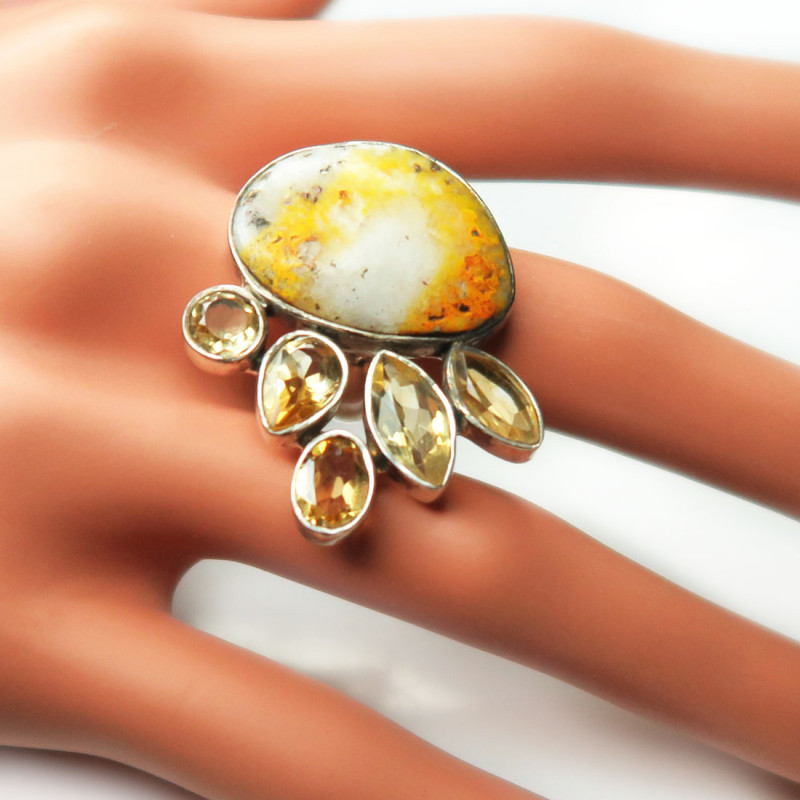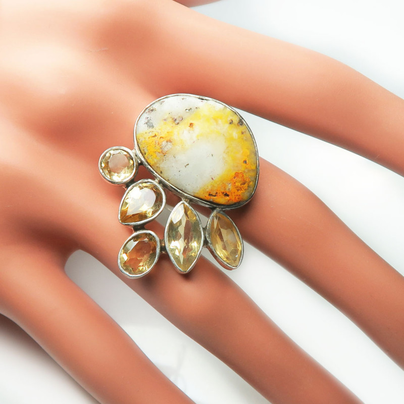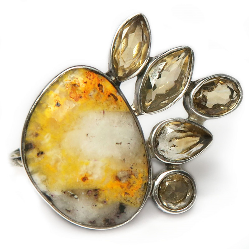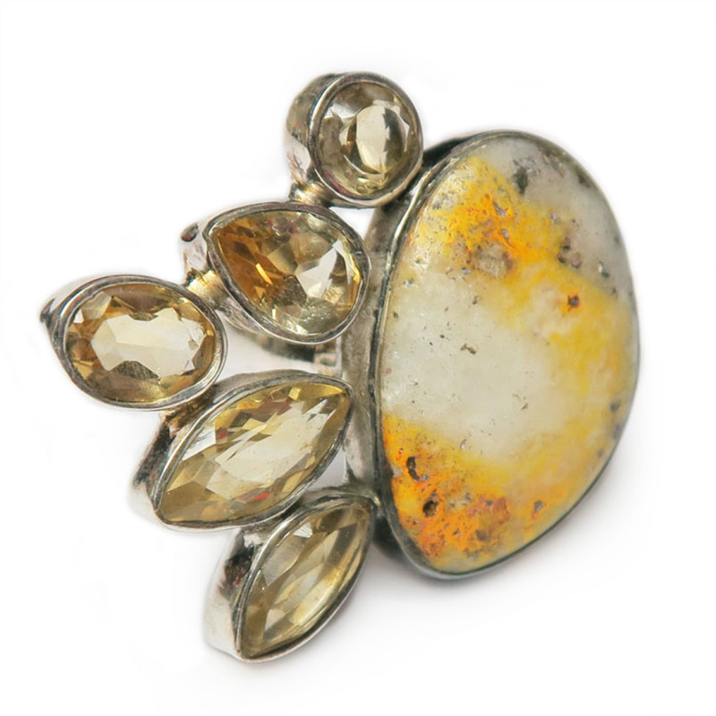 Кольцо с яшмой желто-оранжевого цвета и цитрином, размер кольца 19, размер камня в кольце 1.8*2.5 см., размер изделия 2.5*3.5 см.. серебро, вес кольца 12.1 гр., производство Индия.