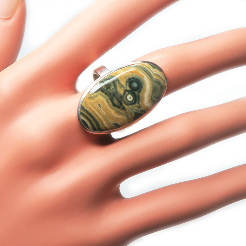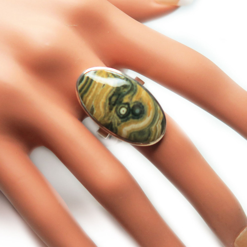 Кольцо с океанической яшмой, размер кольца 19.5, размер камня в кольце 2.8*1.6 см., металл серебро, вес изделия 9.3 гр., производство Индия.