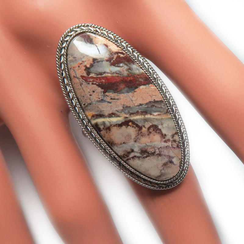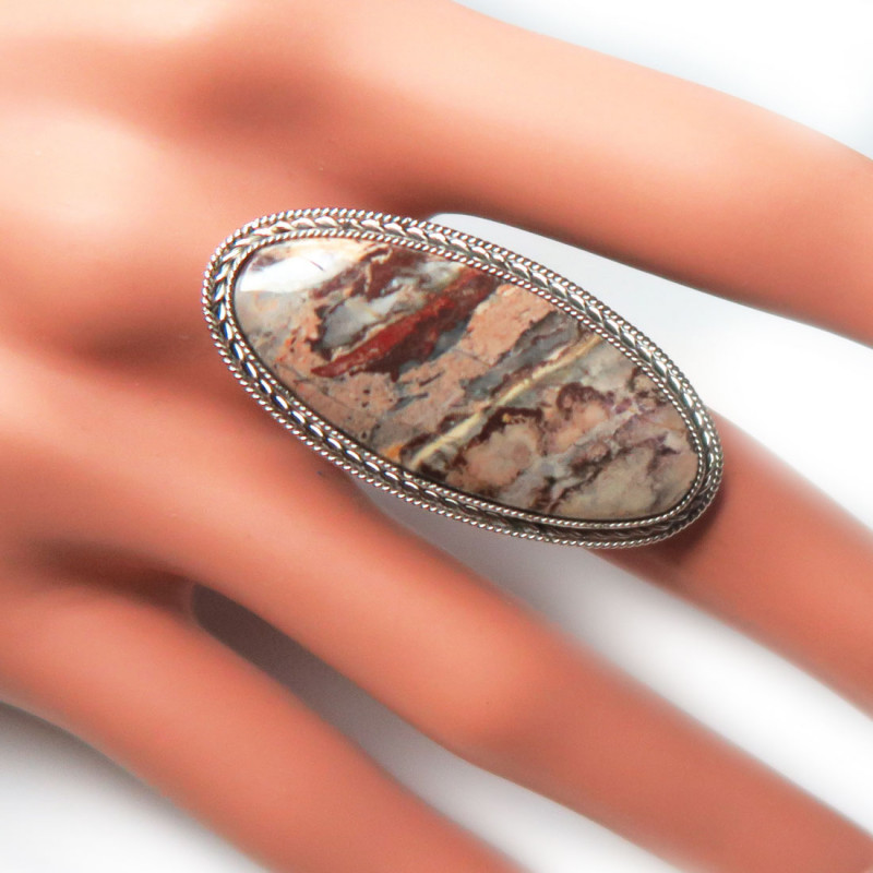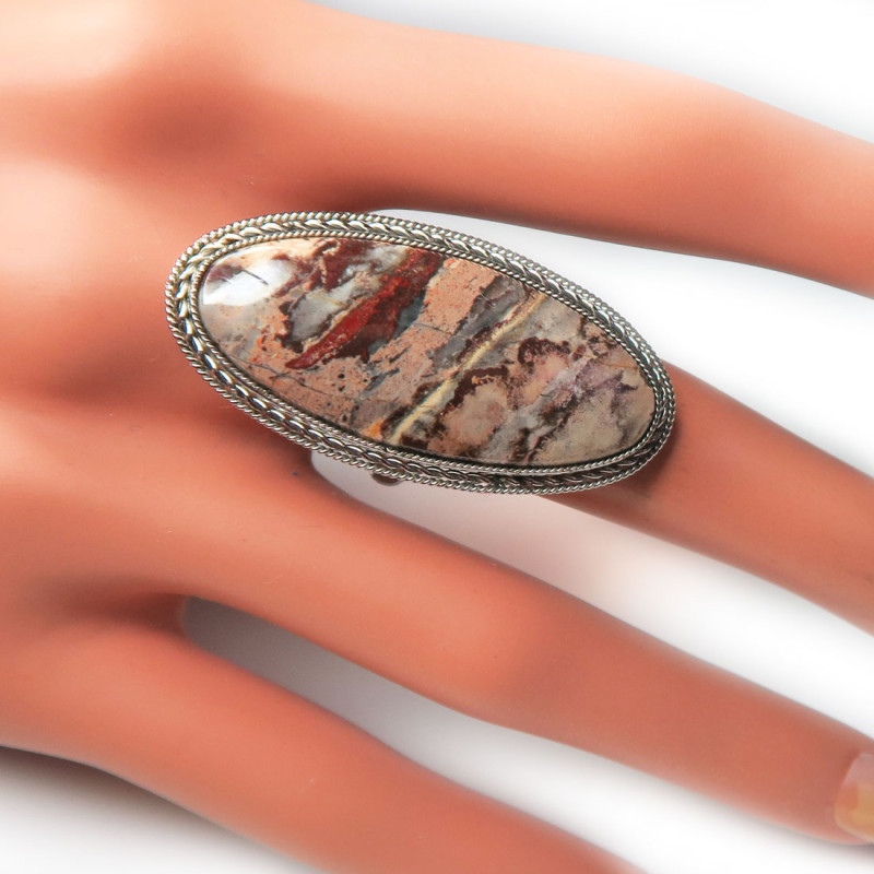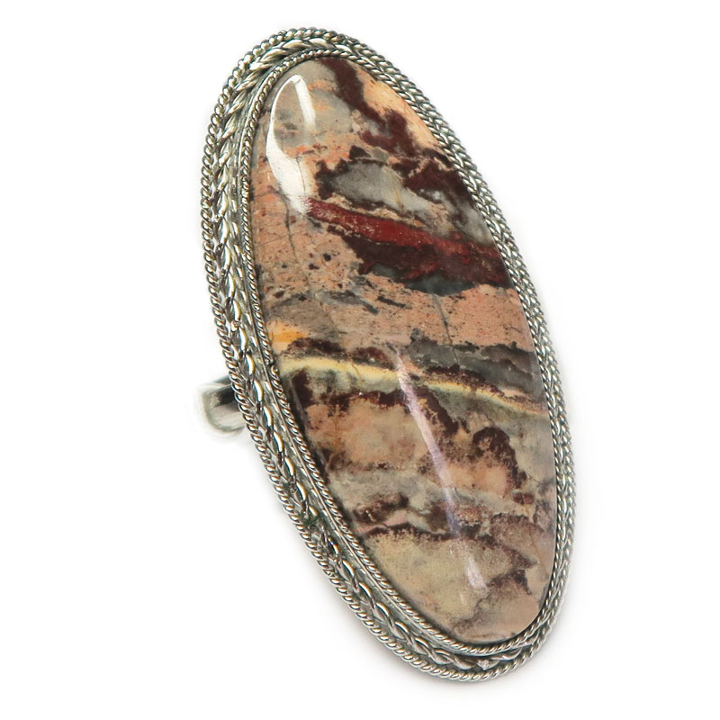 Кольцо с яшмой без огранки размер кольца 19, размер камня в кольце 3.5*1.5 см., металл нейзильбер, производство Россия.