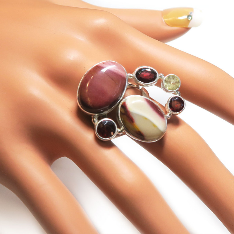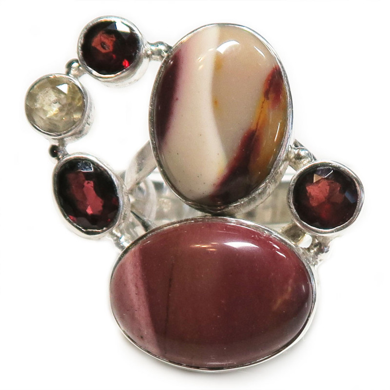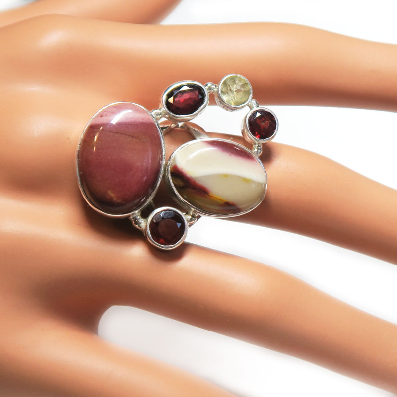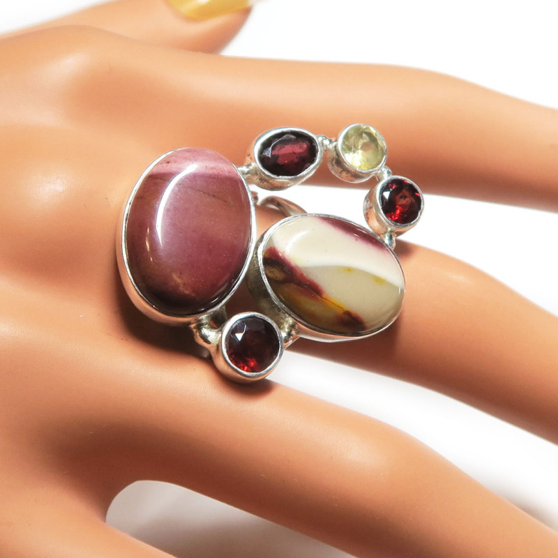 Кольцо с яшмой мукаит, цитрином и гранатом, камни без огранки и с огранкой, размер кольца 18.5,, размер изделия 3.3*2.5 см., вес кольца 12 гр., металл серебро, производство Индия.
