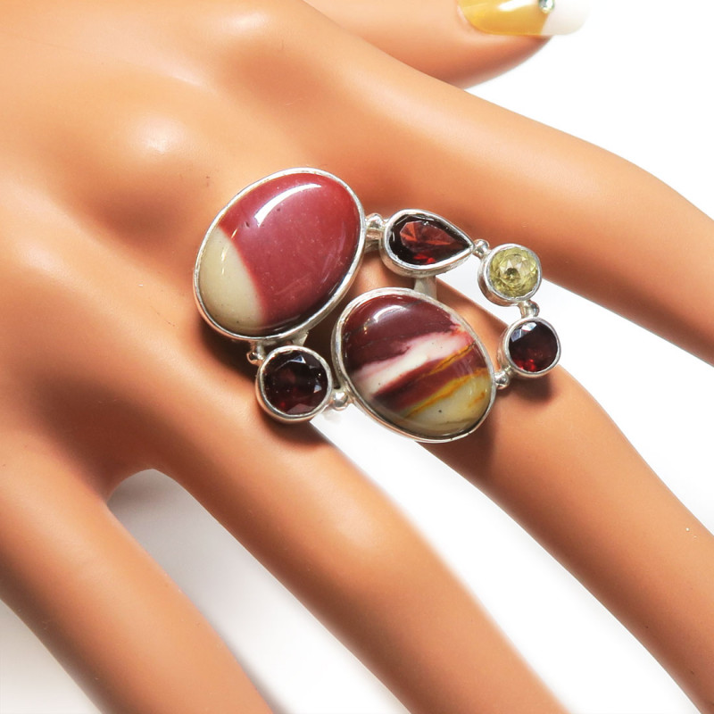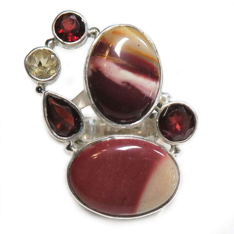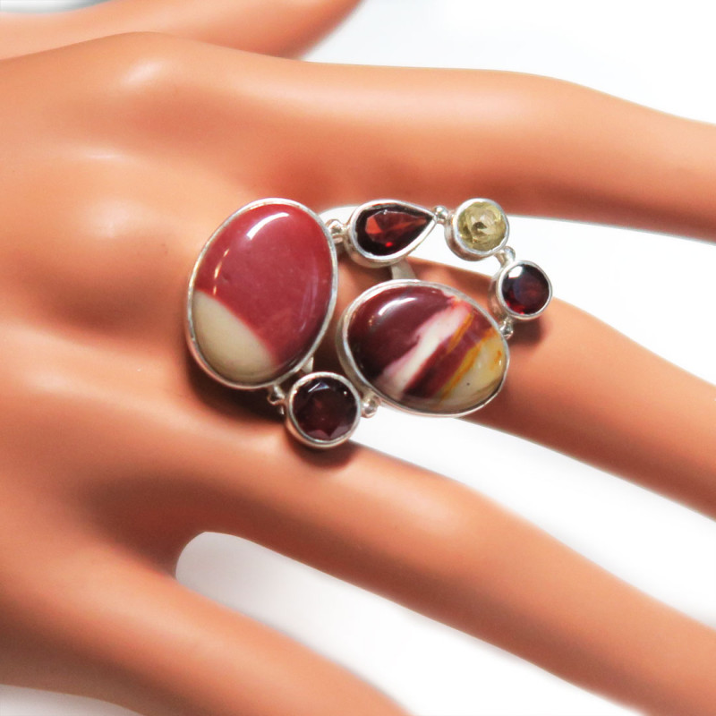 Кольцо с яшмой мукаит, цитрином и гранатом, камни без огранки и с огранкой, размер кольца 17.5,, размер изделия 3.3*2.5 см., вес кольца 11 гр., металл серебро, производство Индия.