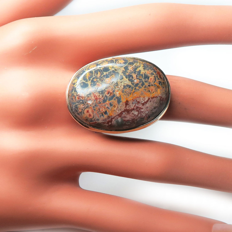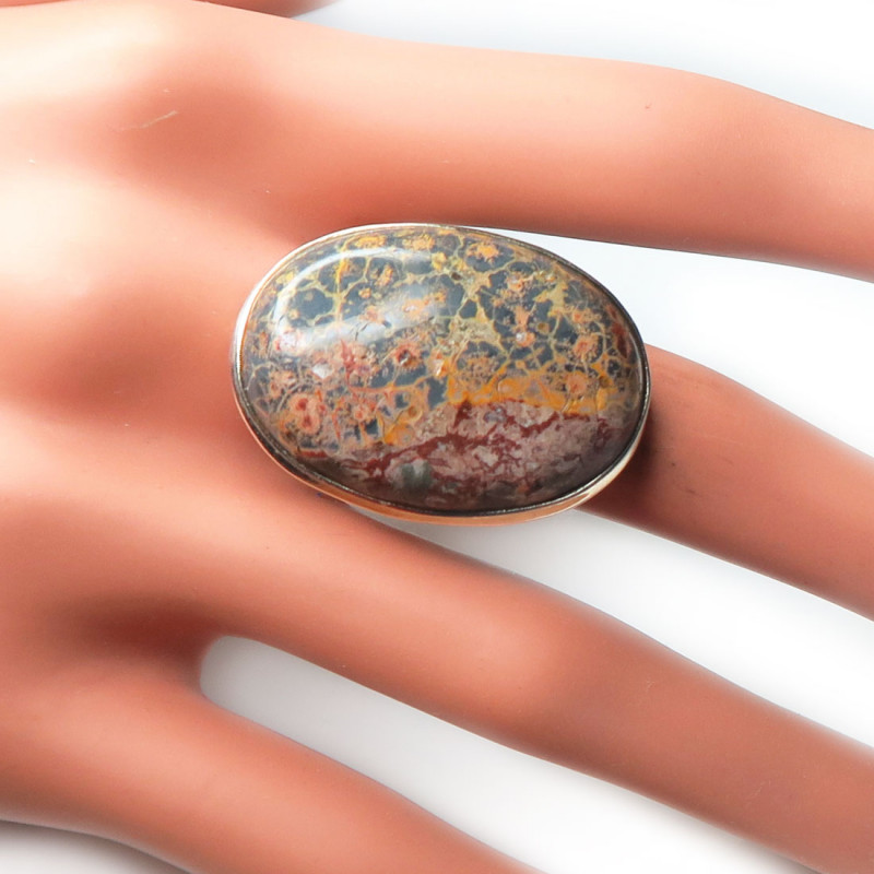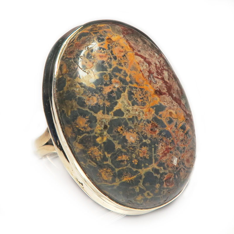 Кольцо с яшмой, камень без огранки, размер кольца 18.5, размер камня в кольце 3*2 см., вес кольца 11 гр., металл серебро, производство Индия.