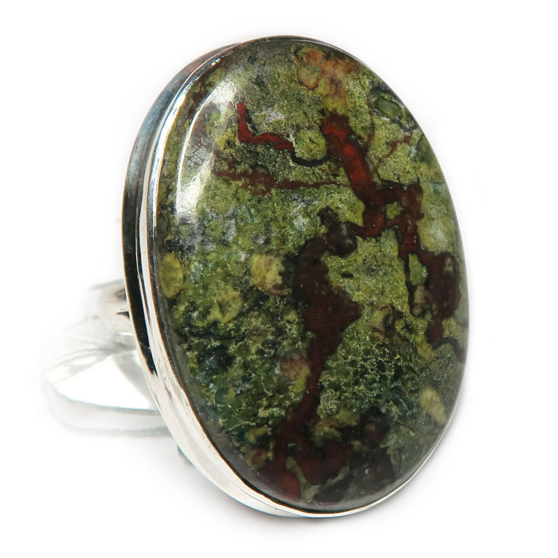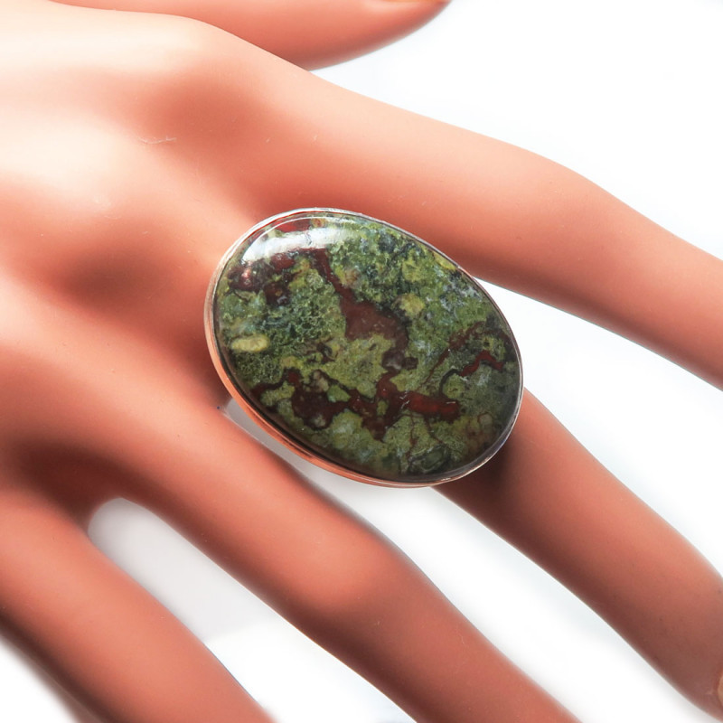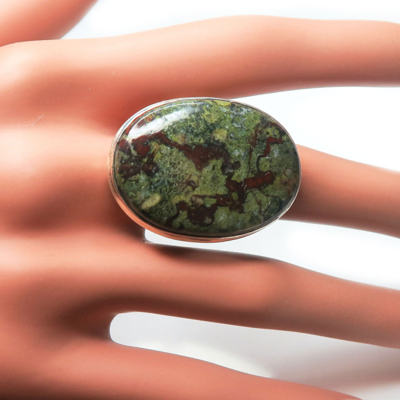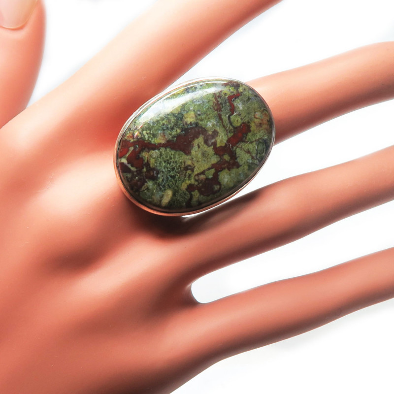 Кольцо с гелиотропной яшмой, камень без огранки, размер кольца 18.5, размер камня в кольце 2.3*3.3 см., вес кольца 13.9 гр., металл серебро, производство Индия.