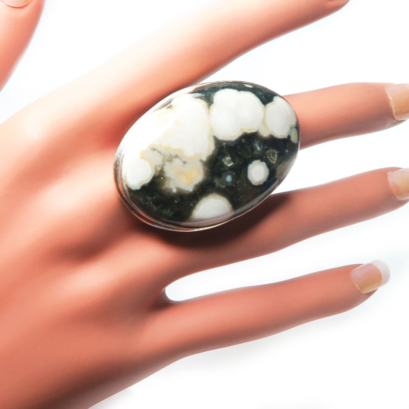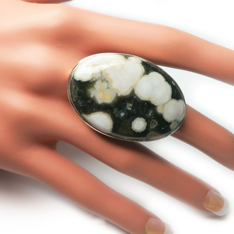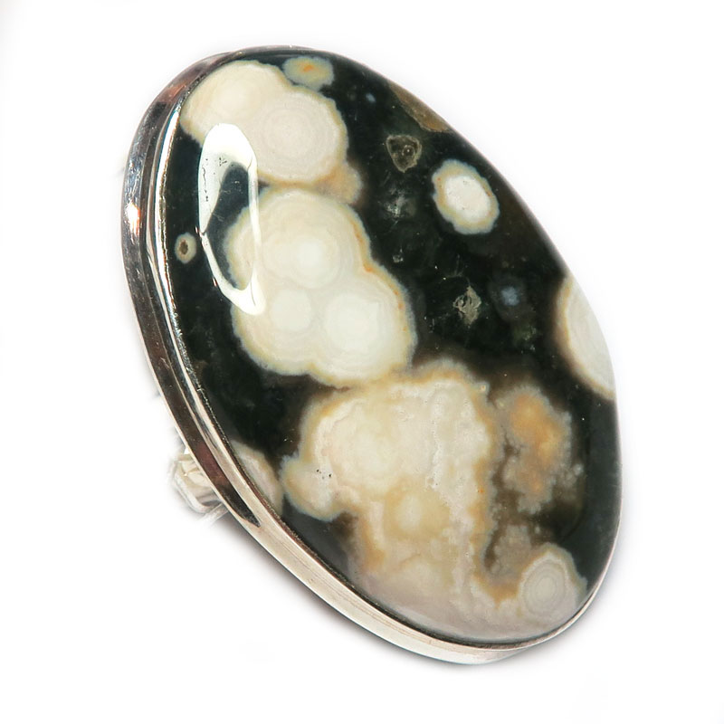 Крупное кольцо с яшмой, размер кольца 19, размер камня 4.4*3 см., вес кольца 21.24 гр., металл серебро, производство Индия.